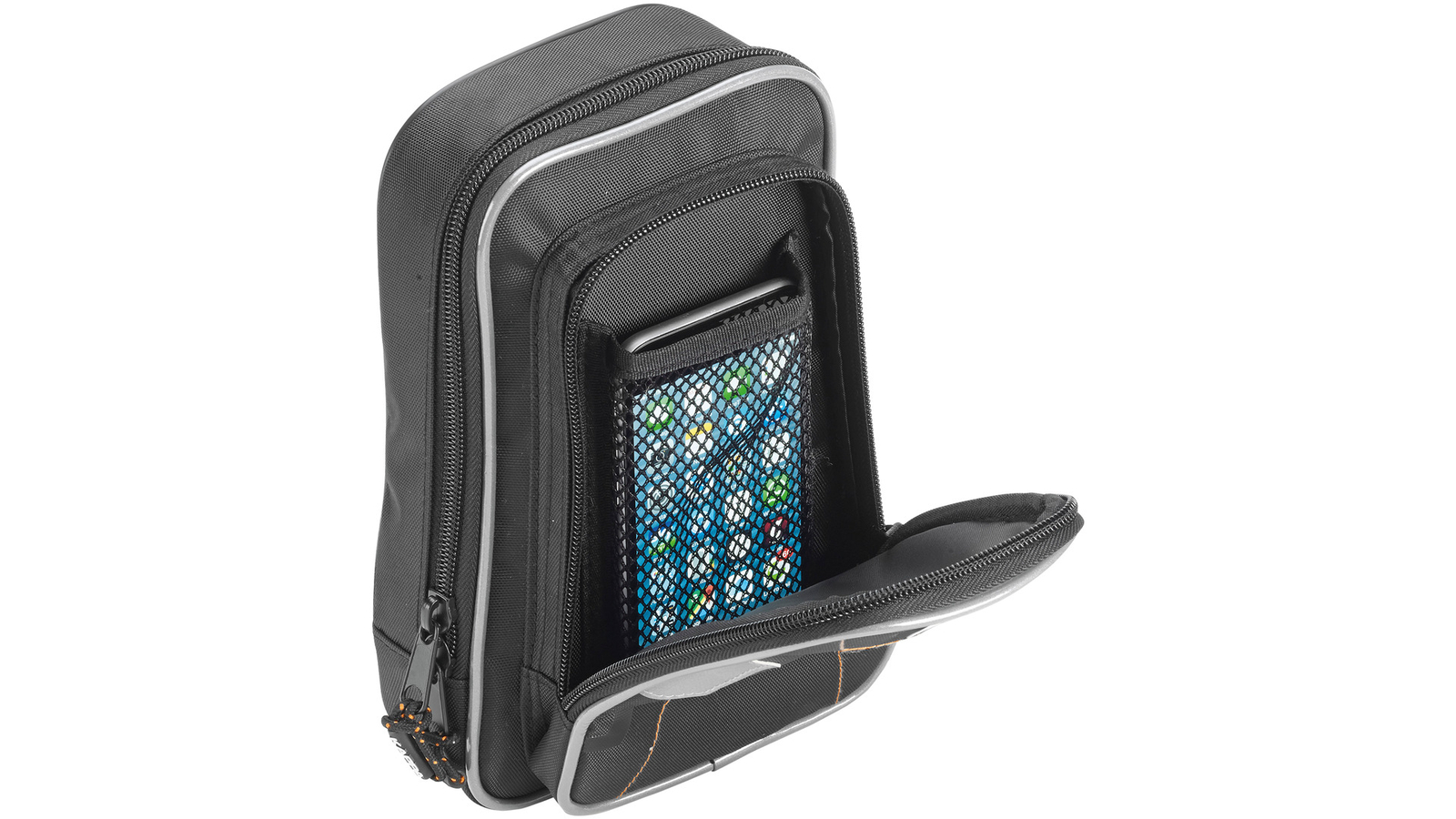 Maße (BxHxT): 14x21x8cm , Fronttasche mit Kabelausgang, Innenfach für das Handy, Befestigung an der Taille und am Bein. Material: Polyester 420D PVC, Einsätze aus reflex silber Material.
